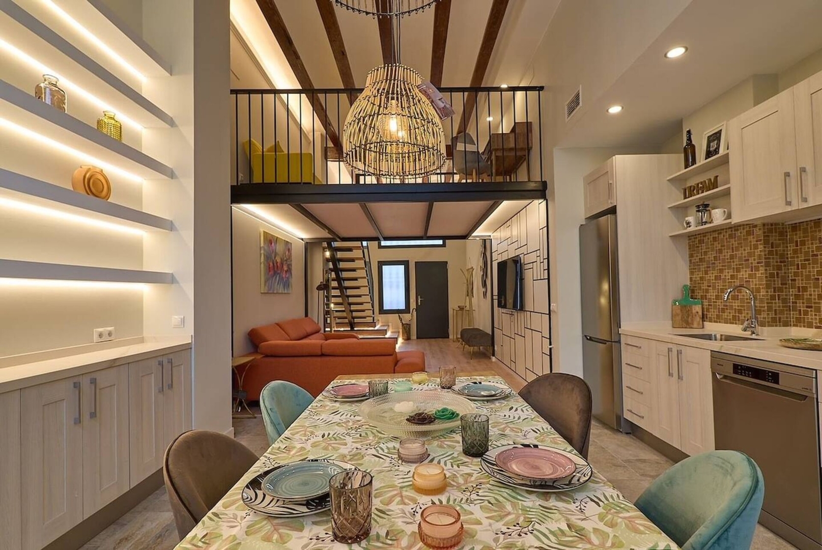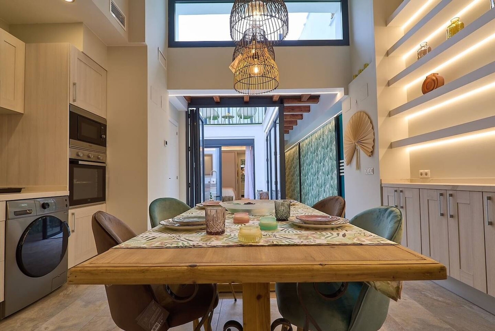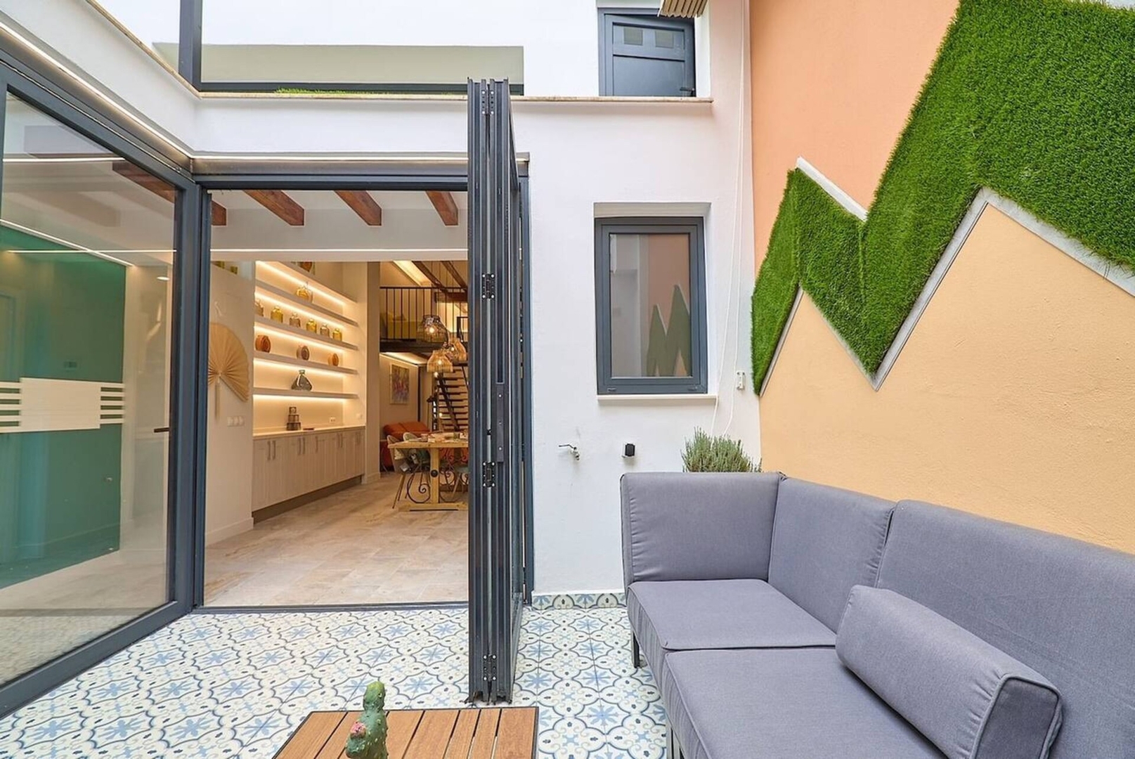 Experience Valencia from one of its most vibrant neighbourhoods with this spacious and beautifully designed apartment in Ruzafa. This 115 m² two-story ground-floor home accommodates up to 8 guests and offers a rare blend of privacy and openness, featuring three large bedrooms each with its own en-suite bathroom, a fourth guest bathroom, and a flexible loft space ideal for work or additional sleeping arrangements. The layout is centered around a private interior courtyard with floor-to-ceiling glass doors that open بالكامل to create a seamless indoor-outdoor living experience, complemented by additional terraces and patios. The apartment is fully equipped with air conditioning, Wi-Fi, a fireplace, modern kitchen appliances, and everything needed for both short and extended stays. Located just steps from cafés, restaurants, markets, Parc Central, and major transport links, it offers both lifestyle and convenience in the heart of Valencia. Please note that the property is intended for families, smoking and pets are not permitted, quiet hours must be respected between 10:00 PM and 8:00 AM, and guest registration is required prior to arrival in accordance with Spanish regulations.